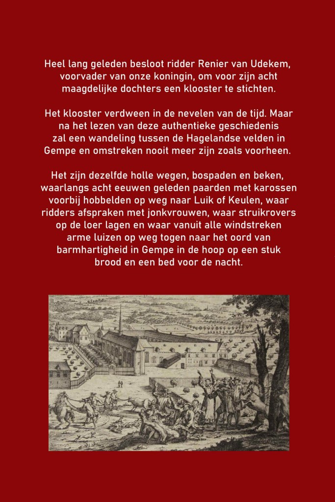 Wie al eens halverwege tussen Leuven en Diest halt houdt en links van de grote baan de velden induikt, komt na wat zoeken terecht in wat overblijft van het oude gehucht met de naam Gempe. Zelf kwam ik jaren geleden wonen in dit paradijselijk stukje Oost-Brabant en al vlug kwamen mij geruchten ter ore over een middeleeuws klooster met acht maagden, dat spoorloos is verdwenen en over de naam d’Udekem, die onze koningin ook draagt. Mijn fantasie was niet weinig geprikkeld en de acht maagden liet me niet meer los.
